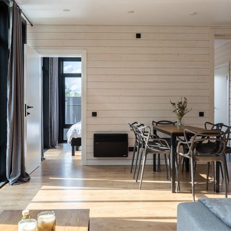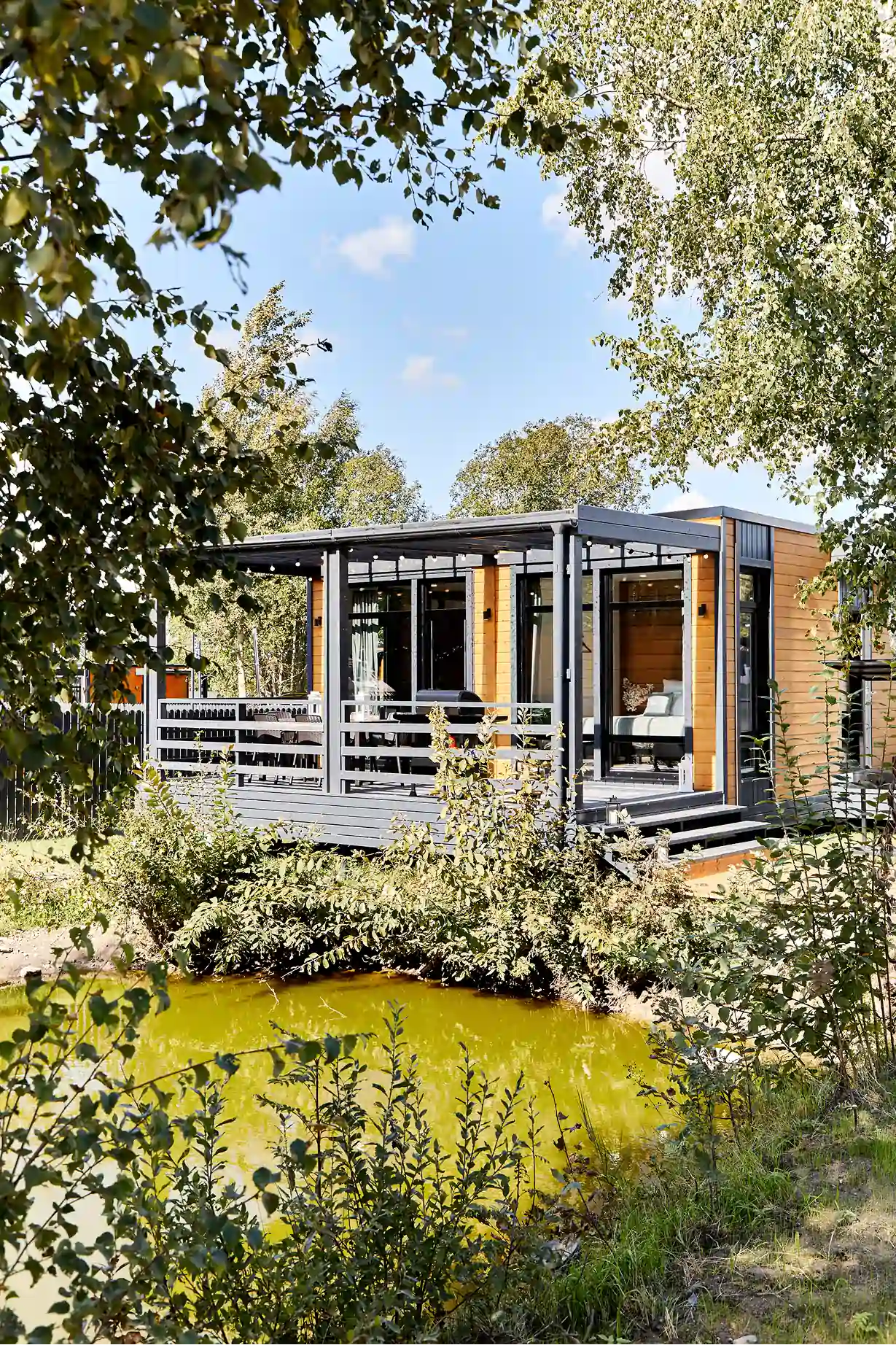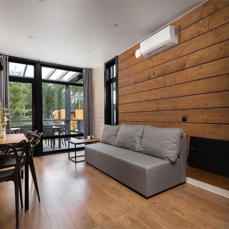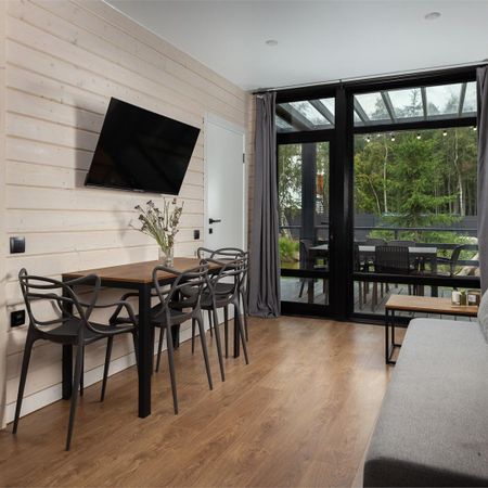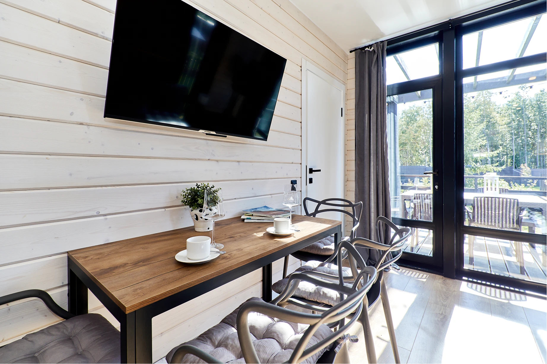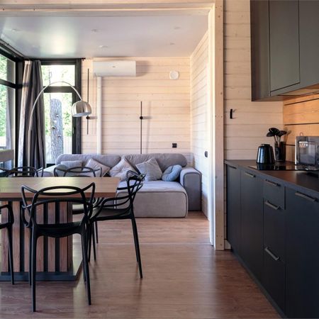 В каждом домике есть кухня‑гостиная с варочной панелью, микроволновкой, холодильником, чайником, посудой и посудомоечной машиной, что позволяет готовить любимые блюда без лишних хлопот.